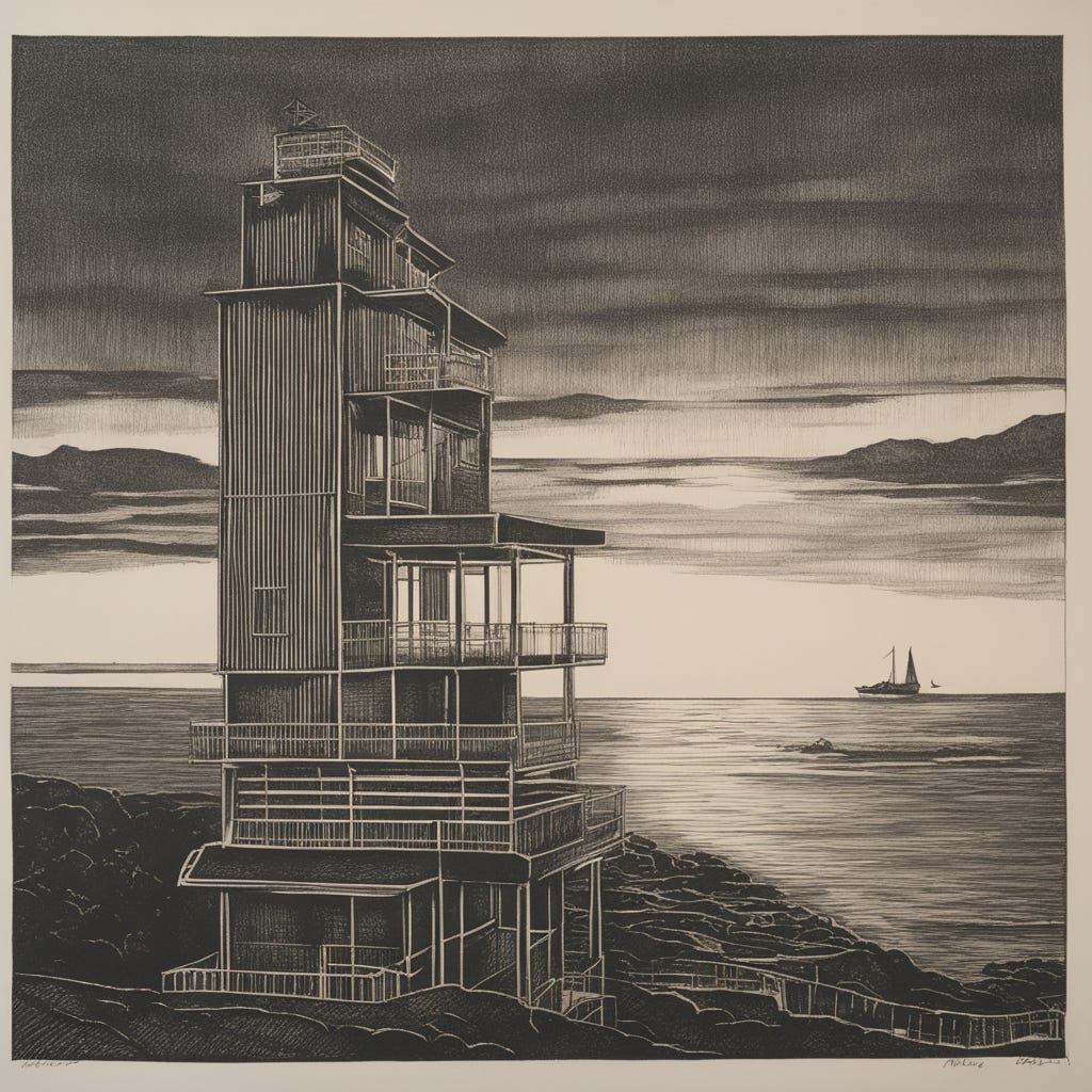 Shutters, driven by a winch, whined and squeaked. Daylight flooded in through the enormous glass window along Ned’s bedroom wall. Distant waves lapped at the shoreline, dozens of stories below. Occasionally, a large breaker came crashing into the rocky shore.